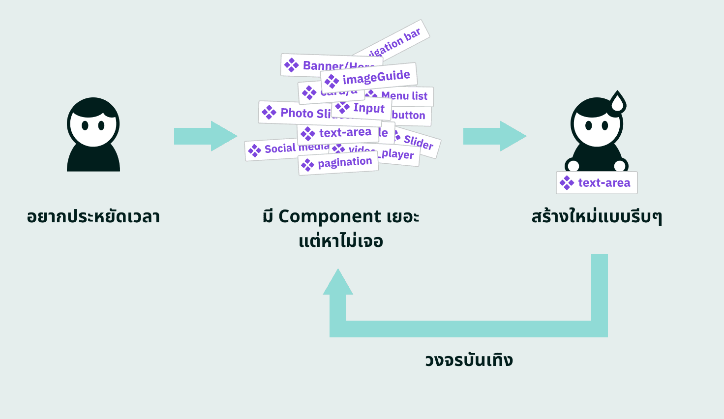 หา component ไม่เจอ → ต้องคอยถามกันว่ามีมั้ย? อยู่ที่ไหน? แย่สุดคือ หาไม่เจอและสร้างใหม่มา