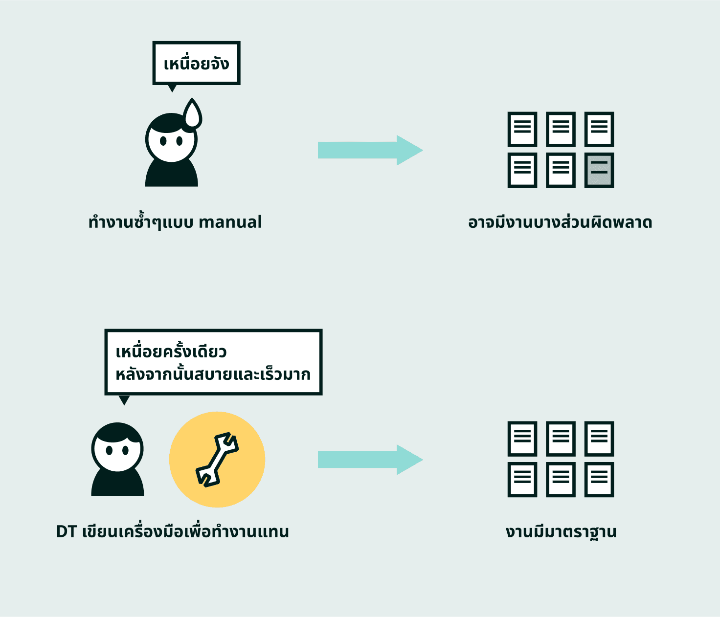 จากสองสถานการณ์ข้างต้น DT จะคอยสนใจปัญหาของทีม และสร้าง tool เพื่อให้กระบวนการทำงานของทีมสะดวกขึ้น และมีข้อผิดพลาดน้อยลง