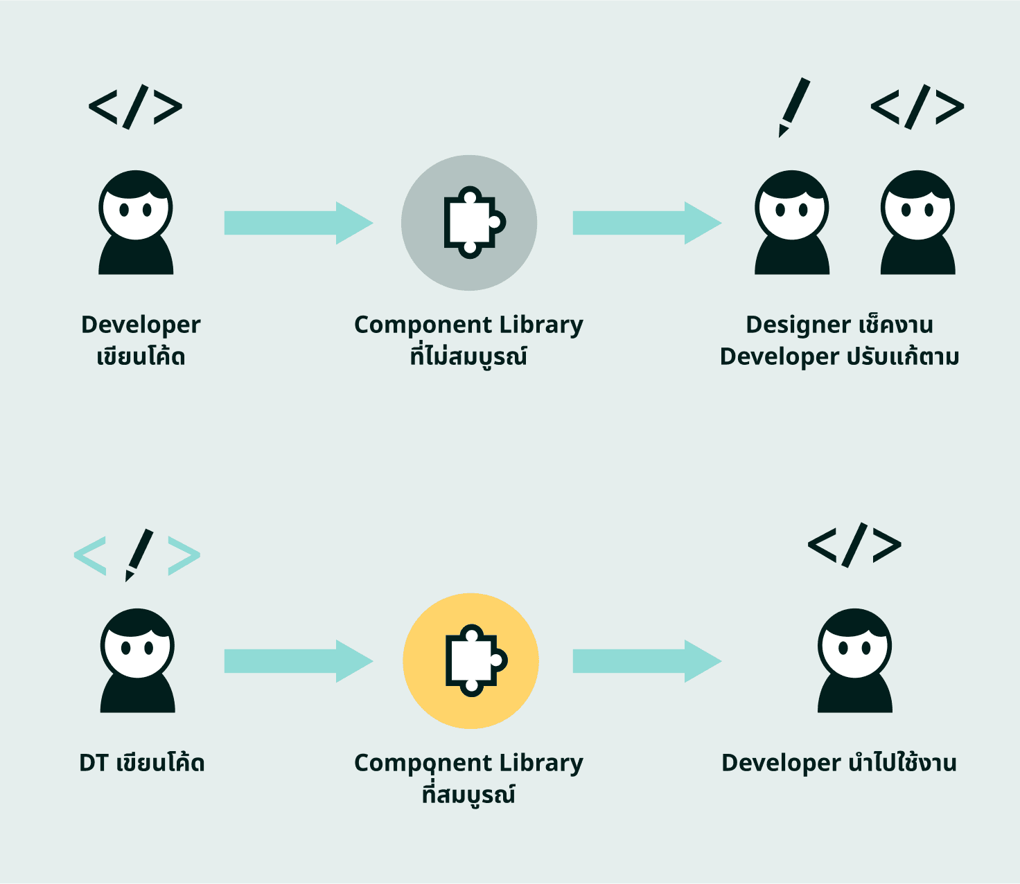 ในกรณีนี้ DT ก็จะช่วย maintain ตัวโค้ด component library ให้เป็นไปอย่างที่ออกแบบไว้ใน design system (ทั้งรูปร่างหน้าตาและ interaction ต่างๆ) โดยจะลดเวลาในการส่งต่องานลง พร้อมทั้งได้คุณภาพที่มากขึ้นเพราะ (1) สามารถหา solution ที่ตอบโจทย์ทั้ง design และ tech ได้ด้วยตัวเอง (2) มีความละเอียดและสนใจในความสวยงามและ interaction มากกว่า developer