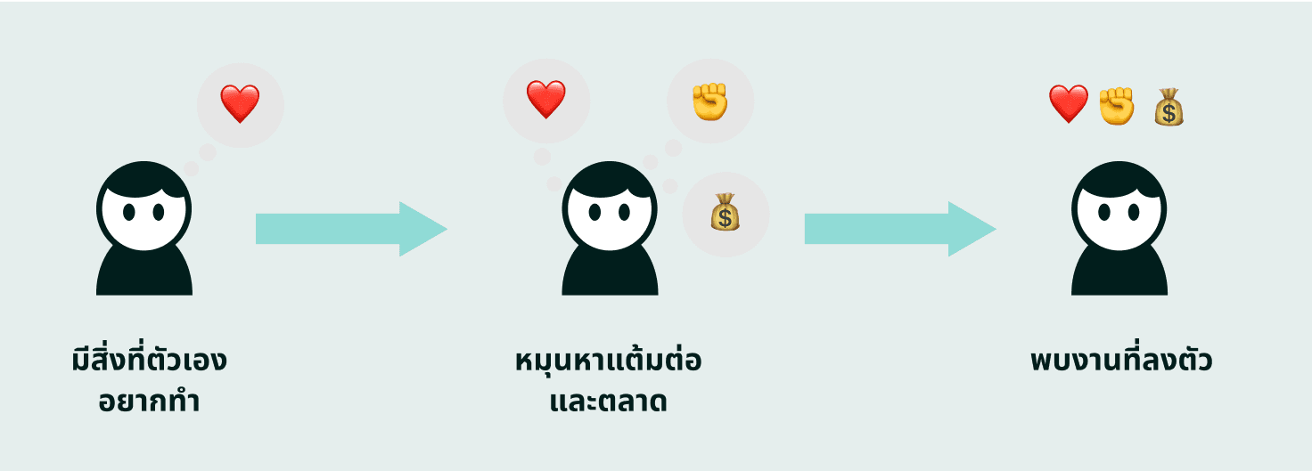 คนที่ได้ทำในสิ่งลงตัวทั้ง 3 ปัจจัย จะทำงานได้แบบติดลมบน (มีความสุขทุกวัน → เก่งขึ้นเรื่อยๆ → มีเงินเข้ามา → .... วนไป)
