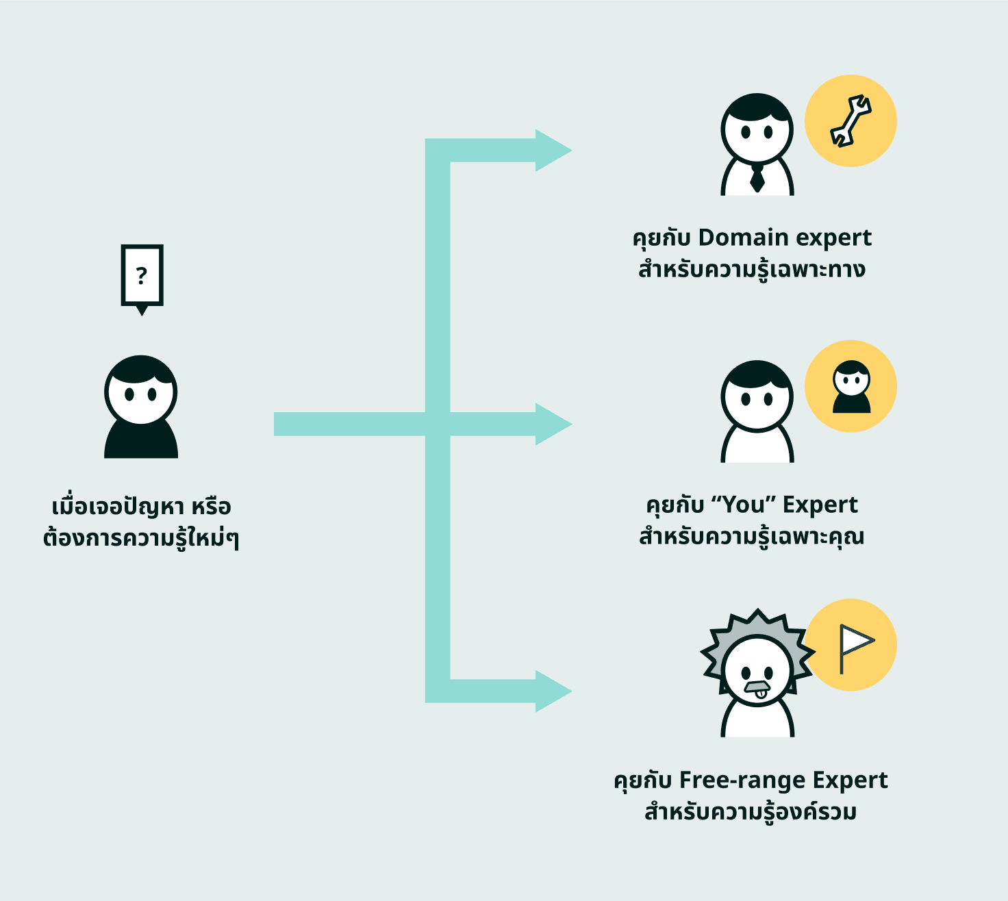Domain expert – ความรู้เฉพาะทาง คือ ผู้เชี่ยวชาญในด้านนั้นๆ เช่น คนนี้เป็นดีไซน์เนอร์ที่เก่งเรื่องการทำ UI มากๆ คนเหล่านี้จะช่วยให้เราทำสิ่งที่เราอยากทำได้อย่างรวดเร็ว