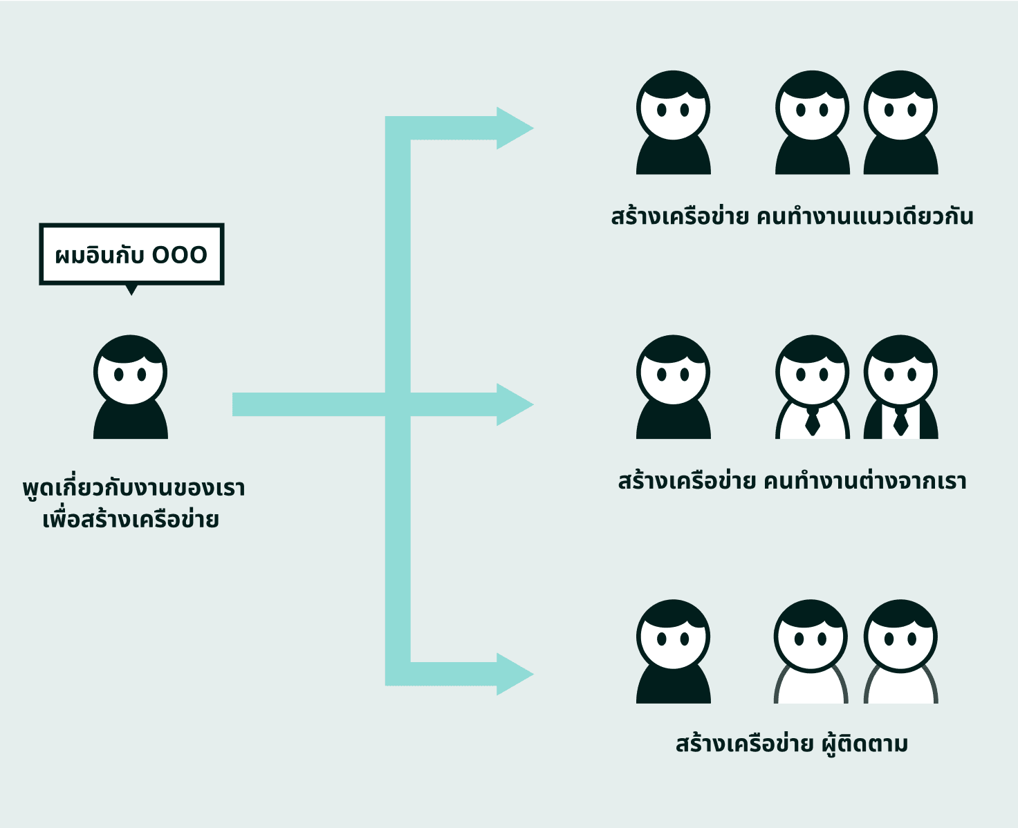 เราควรจะคุยกับคนรอบข้างเกี่ยวกับงานและความสนใจของเราบ้าง เพื่อสร้าง professional network (เครือข่ายการทำงาน) ที่จะช่วยสนับสนุนกันและกัน