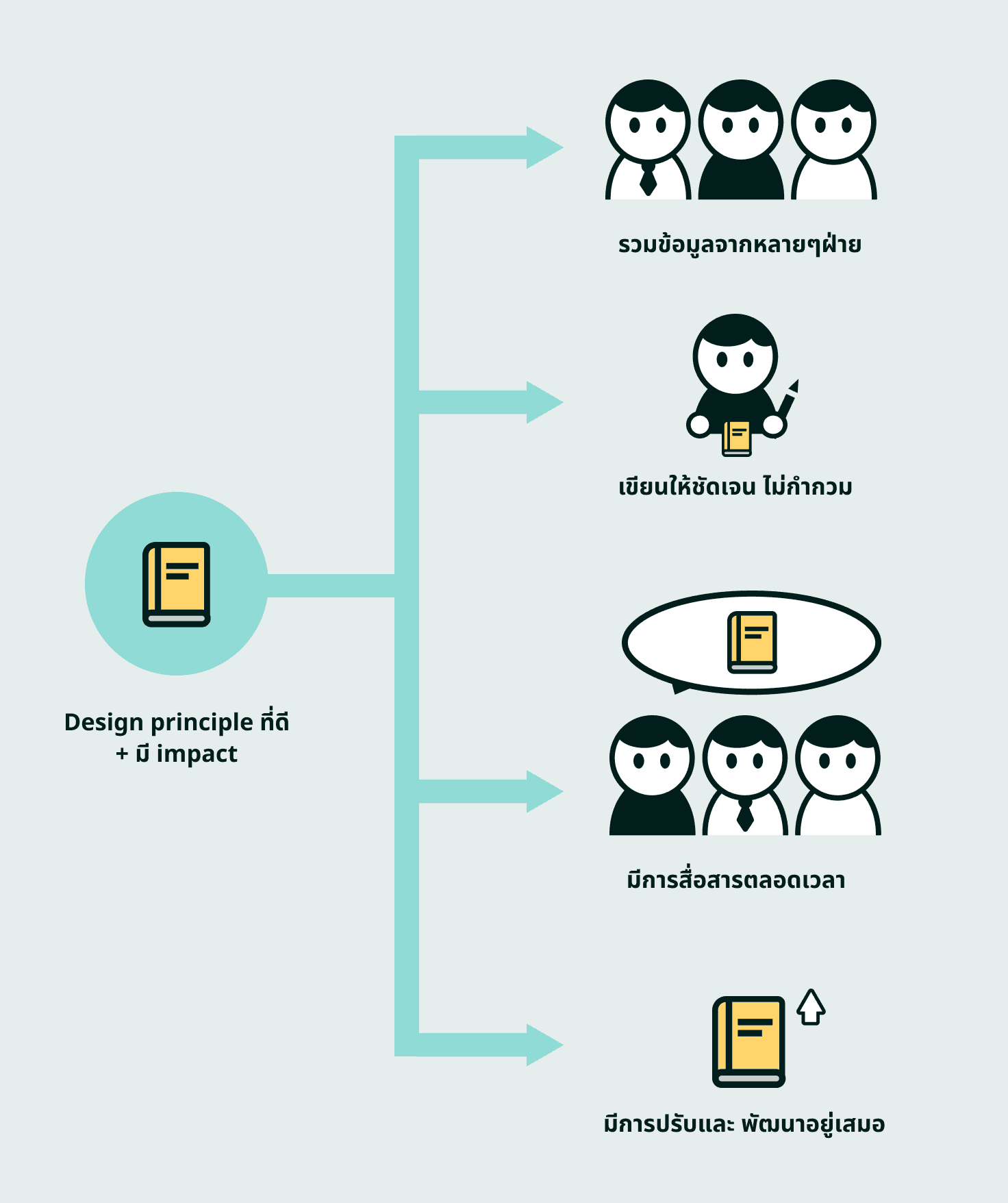 ถ้าทีมเล็ก (เช่น design 2, dev 6, pm 1) → design principle มันอาจจะเป็นแค่การคุยกันไวๆและตกลงร่วมกัน ที่ได้บันทึกอะไรไว้ แต่มีภาพที่เข้าใจตรงกัน